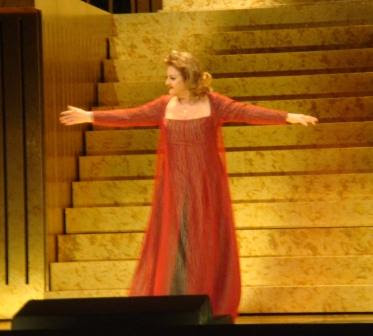 The voice is powerful and of unusual beauty and musicality. The technique excels and in belcanto, she is prodigious. The figure, tall, beautiful and blonde, helps a lot. She played a passionate Giovanna consumed by remorse before the queen The duet with Gruberova at the beginning of Act 2 O mia Regina! was exciting and unforgettable, with the two singers bringing to a superlative level their artistic and vocal qualities.